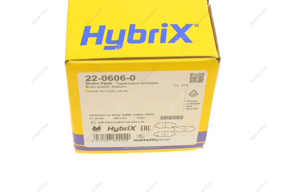 Колодки тормозные (передние) Honda Accord VII 03-08/CR-V II 01-07/CR-V IV 13-/Civic IX/X 14- metelli 2206060